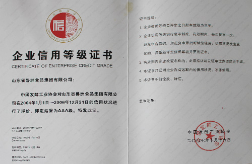 發酵行業企業信用評價AAA級